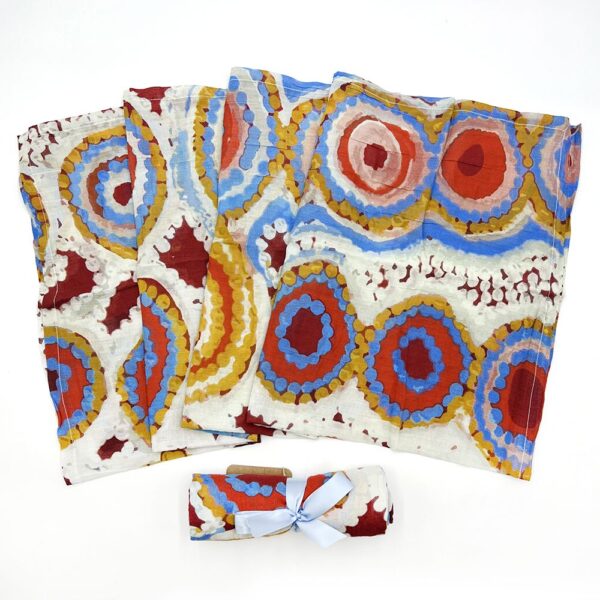 Ramaโs painting goes beyond the depiction of the mingkiri and connects to the broader Wanampi Dreaming, a mythological tale that tells the story of the Rainbow Serpent (Wanampi), the python (kuniya), and other snakes (liru). These creatures are central to the spiritual beliefs of Aboriginal people, particularly in Ramaโs community, where stories are intertwined, or tjungu. The emotional and cultural depth of the artwork makes this baby swaddle more than just a practical item โ itโs a piece of cultural heritage passed on through traditional storytelling.
