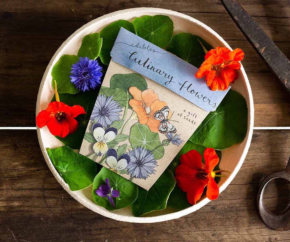 Featuring original artwork by Daniella Germain, the Culinary Flowers Gift of Seeds includes a packet of mixed seeds, a tear-away biodegradable plant label and sowing instructions.