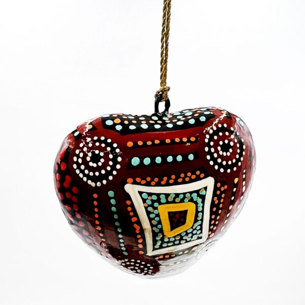 The Decorative Heart_MAB665 is a stunning lacquerware piece, blending Aboriginal artistry with festive charm. Shaped like a heart and resembling a Christmas ornament, it features designs inspired by ceremonial body paint. Aboriginal women traditionally paint their breasts and shoulders for ceremonies, using song and dance to tell their ancient stories. The concentric circles in the design symbolize meeting places or ceremonial gatherings, capturing the essence of connection and community.