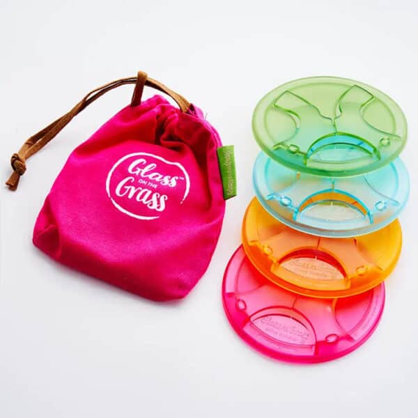 Ingenious coasters are designed by Stephen and Lee at Glass on the Grass to keep your wine glass steady in outdoor settings.