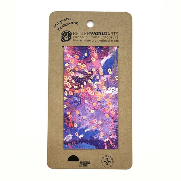 Each Magnetic Bookmark_SJN699 reflects the essence of this ancient story while also serving a practical purpose. Designed with secure magnetic clips, this bookmark not only marks your place in any book or journal but also invites you to connect with the cultural heritage of the Warlpiri people. The bookmark is handcrafted through Better World Arts, supporting Aboriginal artists and promoting cultural preservation.