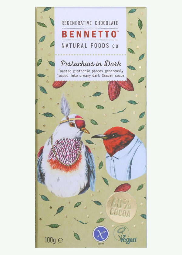 Indulge in Bennetto’s Pistachios in Dark – 100g bar, a rich blend of smooth dark Samoan cocoa and crunchy toasted pistachios. Vegan, gluten-free, and dairy-free, this chocolate delivers bold flavors and guilt-free enjoyment. Perfect for those seeking a delicious and ethical treat.