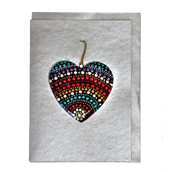 A beautifully hand-crafted heart keepsake adorns this eco-friendly card. Artwork designed by an Aboriginal artist and the heart is hand-crafted by skilled artisans in the Kashmir Valley.