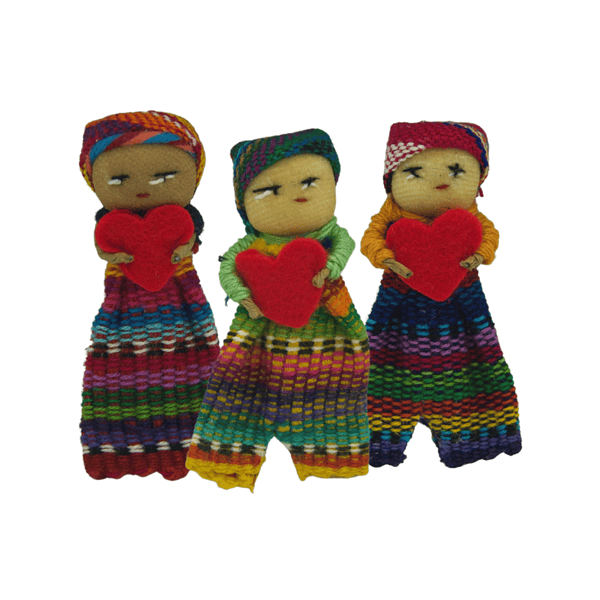 Our worry dolls are sourced through Novica and are made by the Lopez Garcia Family in Guatemala. Working with cotton on the traditional floor loom, the talented artisans hand-weave the colourful dresses of each distinct worry doll. This cute little doll carrying a heart comes with its own little storage pouch. Hand-crafted item — colours will vary slightly. Each one is different.